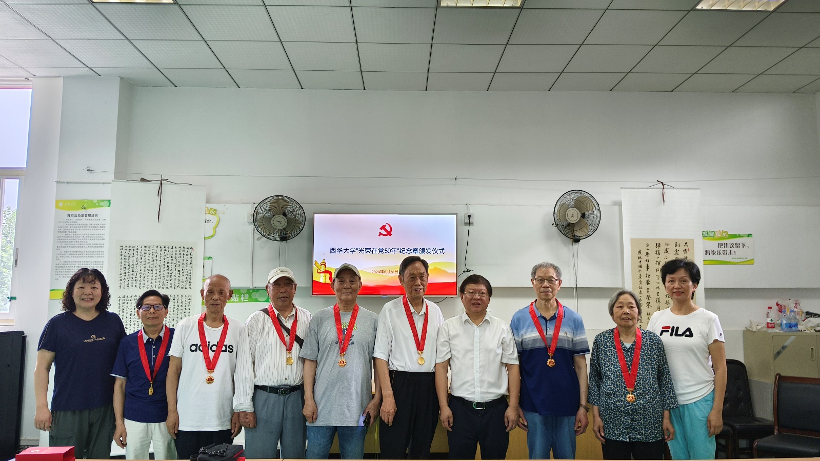 6月28日上午,我校在夕阳红活动中心201室举行了“光荣在党50年”纪念章颁发仪式,表彰那些为党和学校事业默默奉献的老党员,副校长刘小兵出席仪式并向老党员们颁发了纪念章。