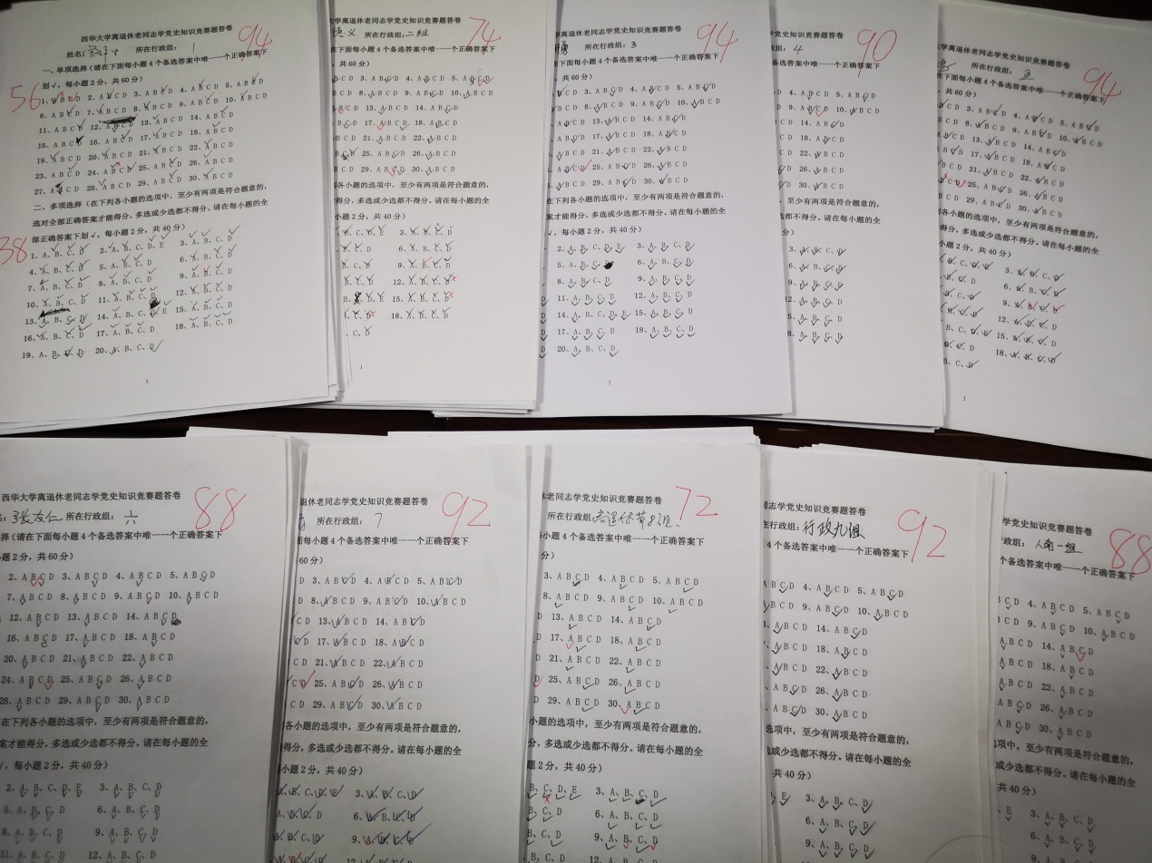 老同志们在身体条件允许的情况下,自愿到三个校区领取试卷参加竞赛。本次竞赛从试卷发放、老同志答题、试卷评分统计历时近一个月,共发出试卷500余份,在规定时间内收到有效试卷425份。考虑到老同志学习和答题的实际情况,我们从bevictor伟德党校出版社编写的《中国共产党党史知识竞赛1500题》中选取了30道单项选择题和20道多项选择题组成试卷,采取开卷答题形式。经过阅卷,得分在60分以上的共385人,其中90分以上的122人,最高分98分。参加本次竞赛的老党员243人,其他老同志182人,年龄最大的97岁。