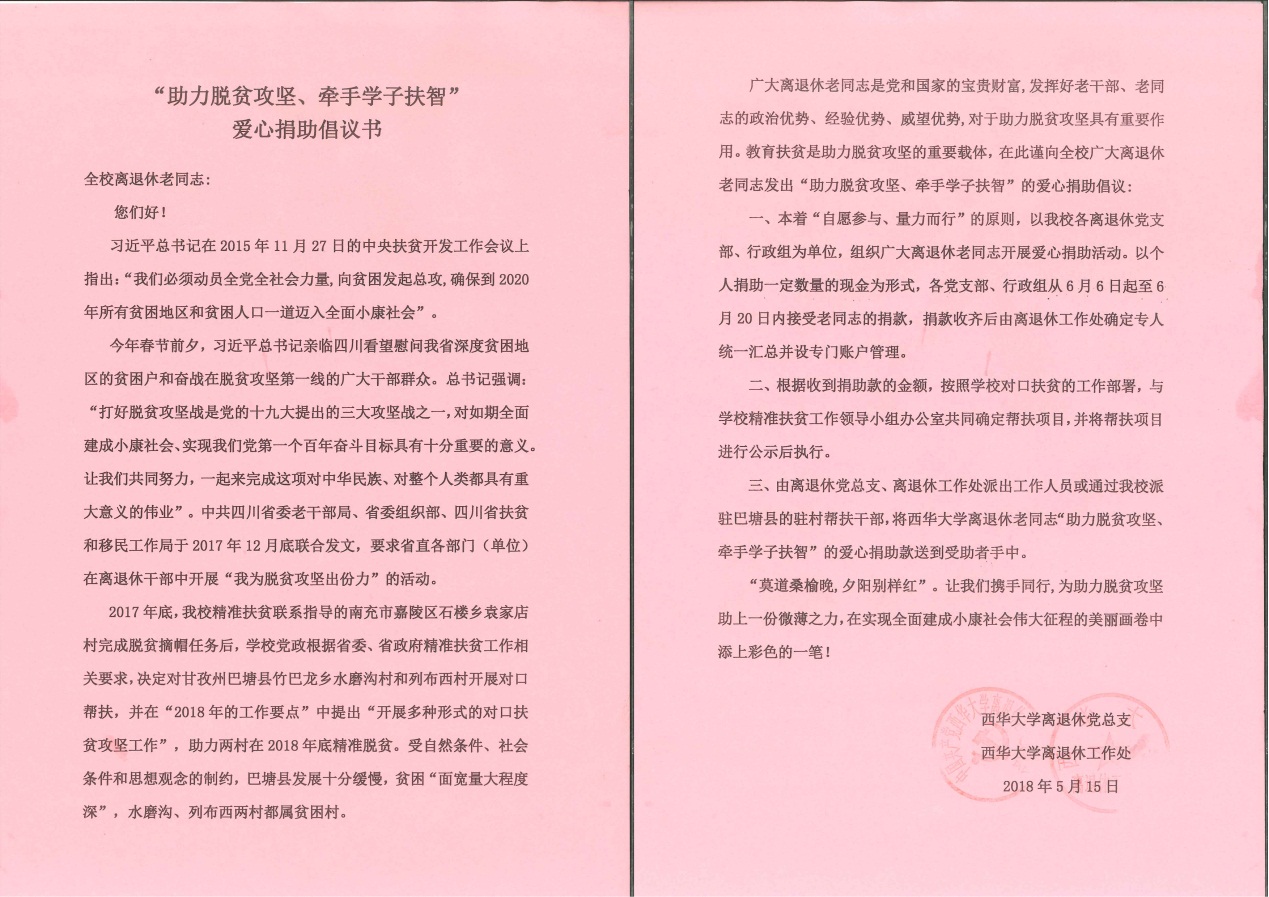 截止6月26日,bevictor伟德共收到六百多位老同志的爱心捐款共计四万余元,其中有三位离休老干部分别捐出了一千元的爱心捐款。目前,这笔爱心捐款已存入“四川bevictor伟德教育发展基金会”专门账户,下一步bevictor伟德将与我校精准扶贫工作驻村干部一起商定捐助帮扶项目,公开、透明、合法、合规地将老同志的爱心传递到巴塘高原。