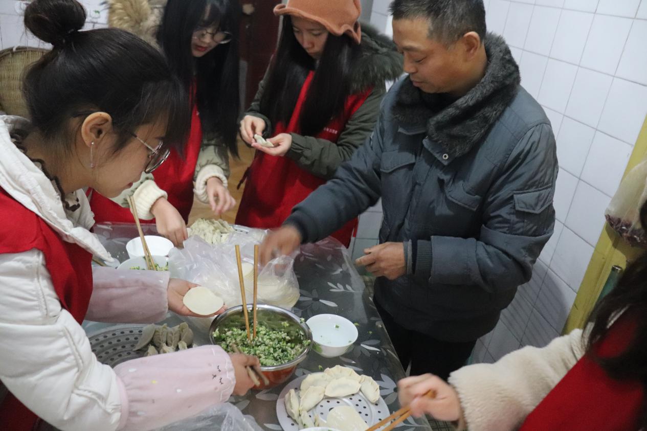 志愿者们在退休教师夏玲玲的家中包饺子、聊家常,为老人们送去新春佳节的祝福。师生们围坐在夏老师身边,聊天交流,其乐融融。志愿者们在她家中清理打扫房间,然后贴上窗花、春联以及“福”字,随后一起包饺子、煮饺子。夏老师对志愿者师生们的帮助和祝福感到十分高兴,即兴演唱了一首《最美不过夕阳红》,志愿者们也合唱了《歌唱祖国》和《新年好》,欢声笑语充满整个房间。
